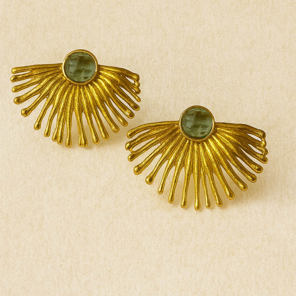A radiant sunburst of sculpted gold crowned with a faceted gemstone.